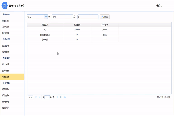 此模塊匯總所有開支項目對應的憑證金額,貸為收入,借為支出。可按時間查詢。